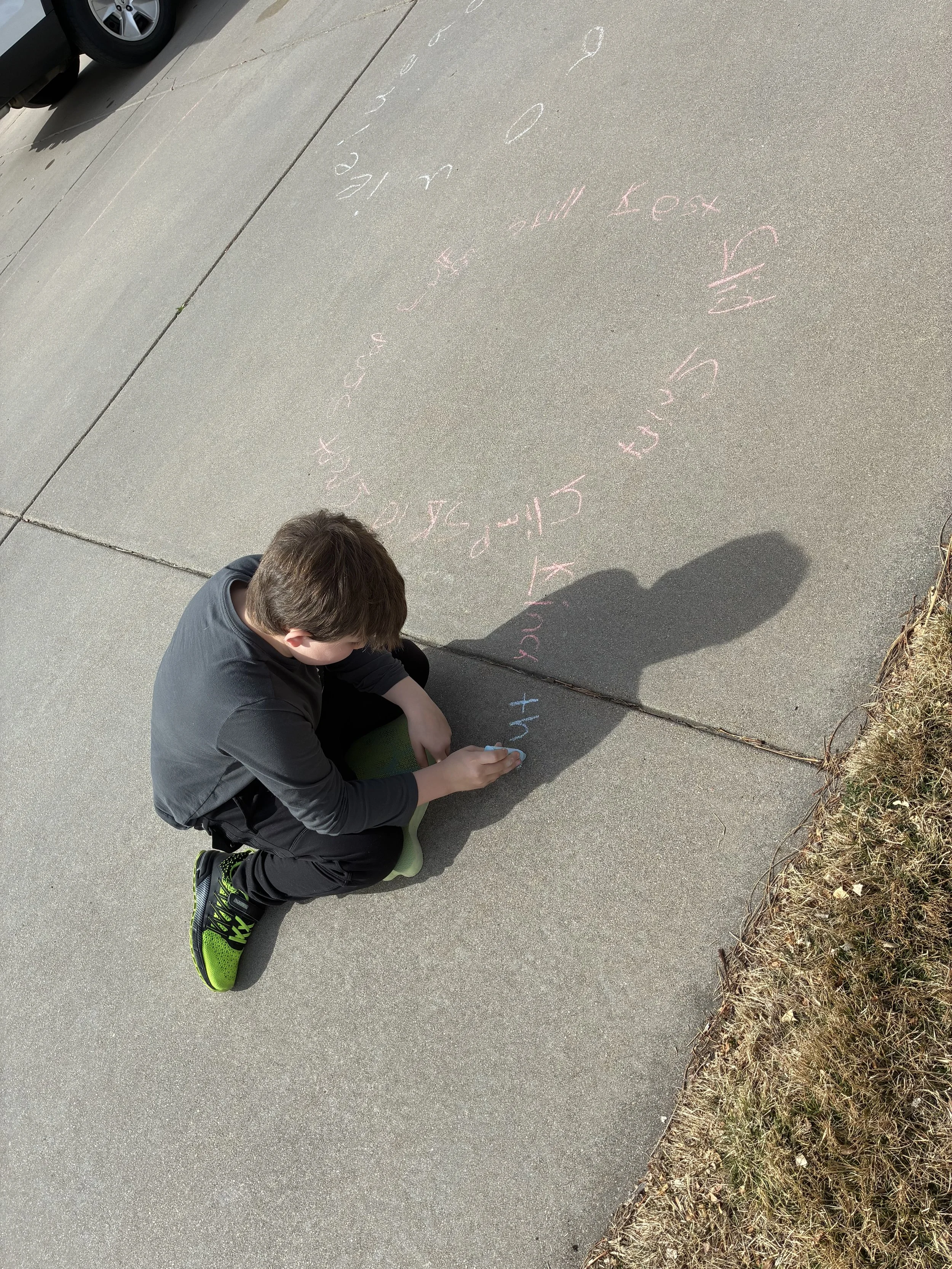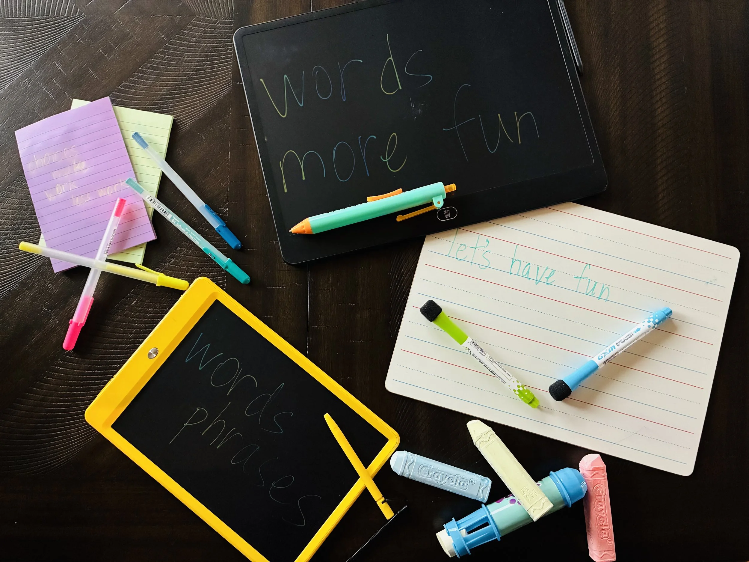 For spelling sight words, words that emphasize the rule/s we are studying, phrases or sentences, well, there are many choices here. I find my students like having choices. They can choose differently as their mood dictates. We use boogie boards, white boards, fun paper & gel pens as well as sidewalk chalk with a turtle knee pad. I love adding the kinesthetic to our work and fresh air and sunshine are also so very beneficial!